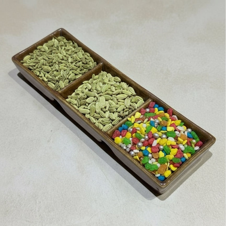 Crafted from durable stoneware, it's both chic and sturdy. With three separate compartments, it makes for the perfect tray to serve all your chutneys and onions at once.